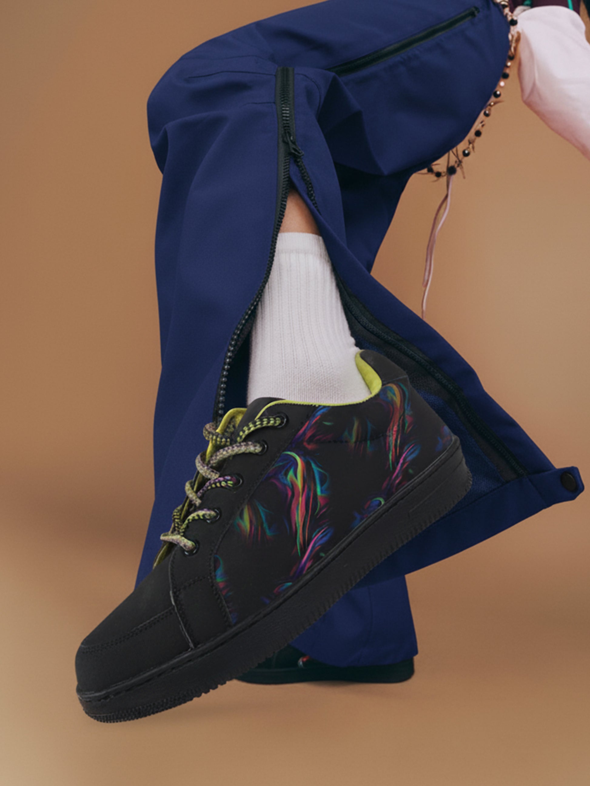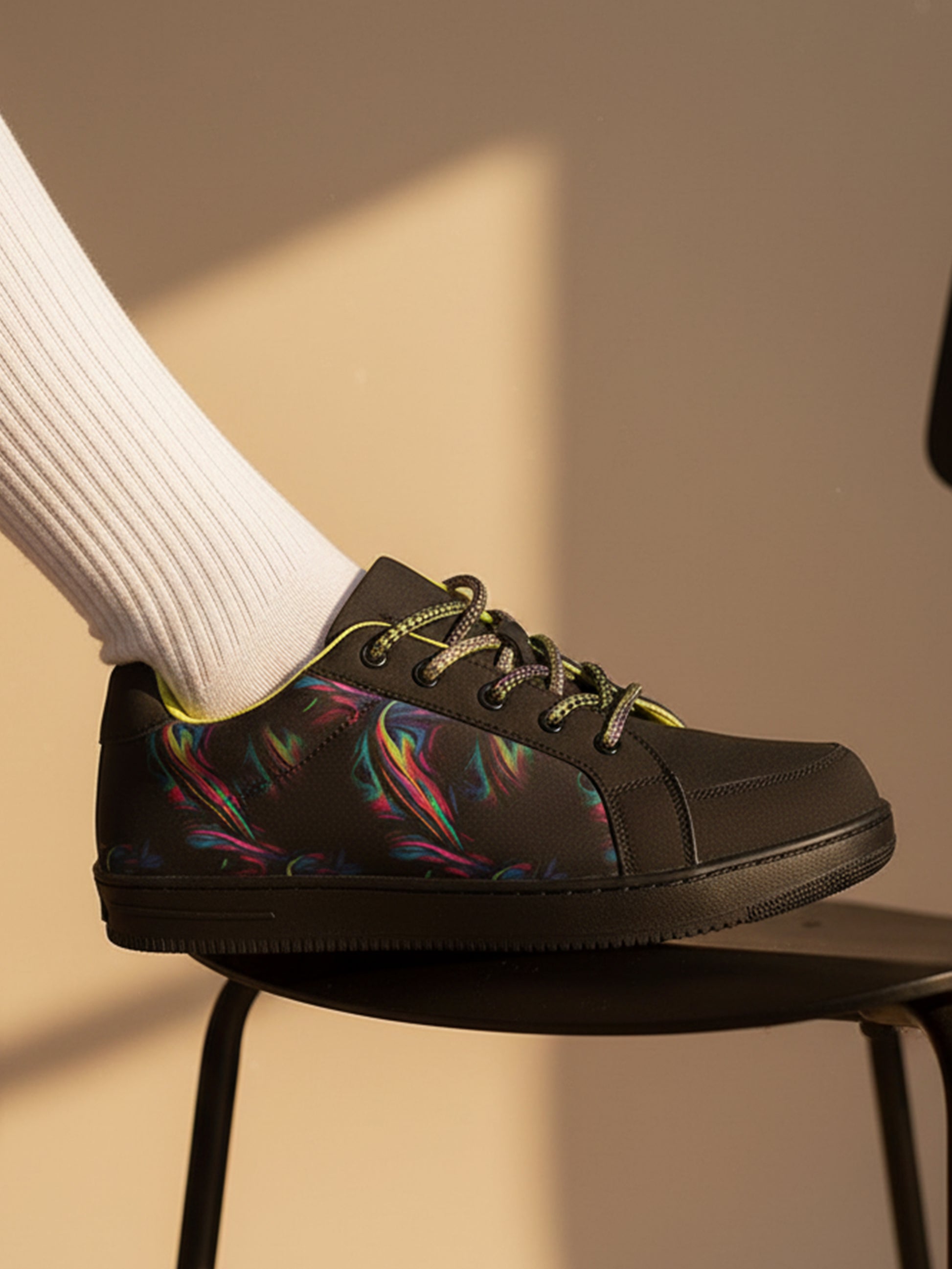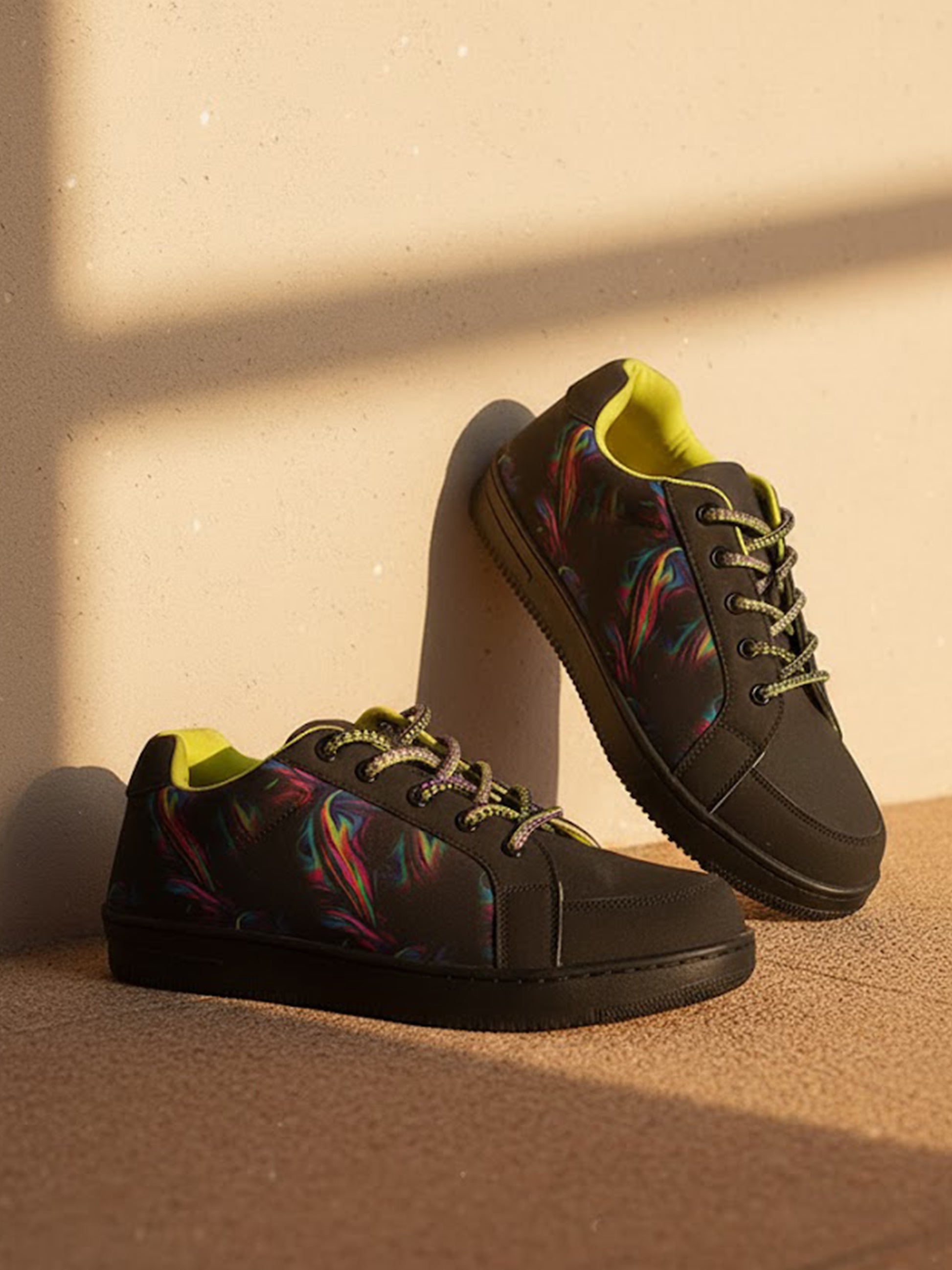 Neon Vibes, Sleek Moves – A striking fusion of sleek black and vibrant neon accents, this sneaker is for those who dare to stand out. Its minimalistic silhouette balances bold colors with refined structure, while the textured sole and sharp contrasts make every step a confident statement. Perfect for turning heads on the street or elevating your everyday look with fearless, futuristic style.