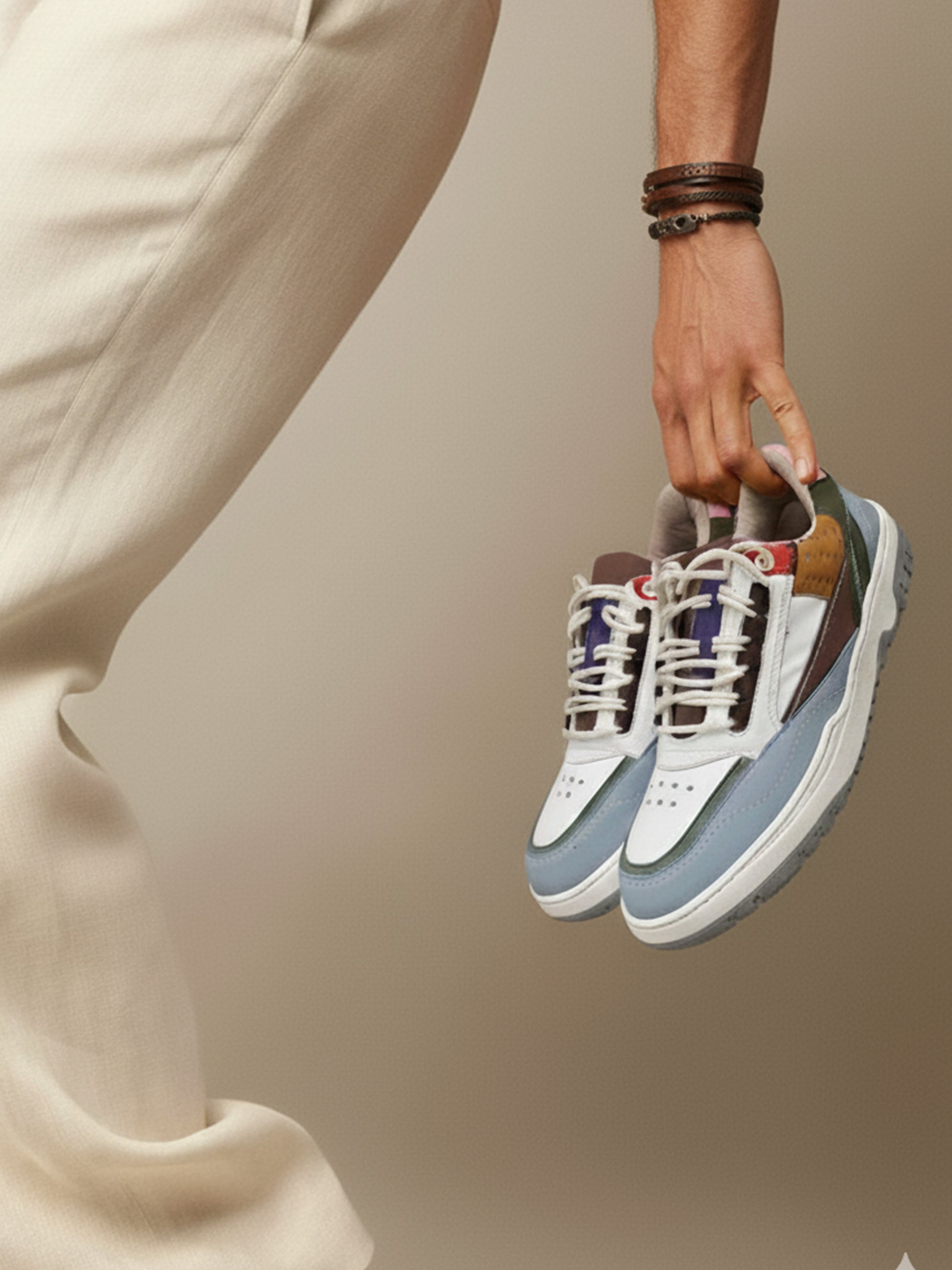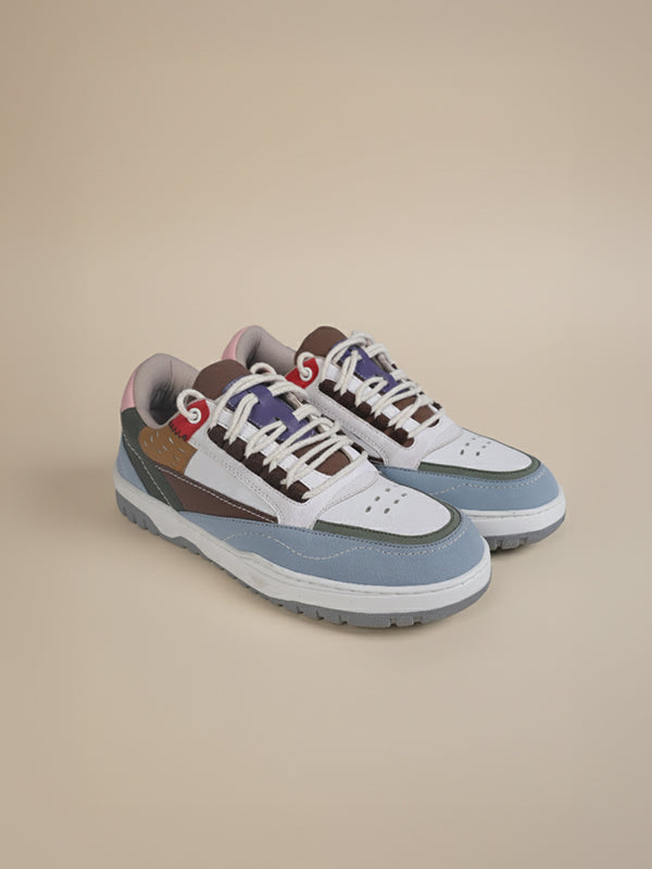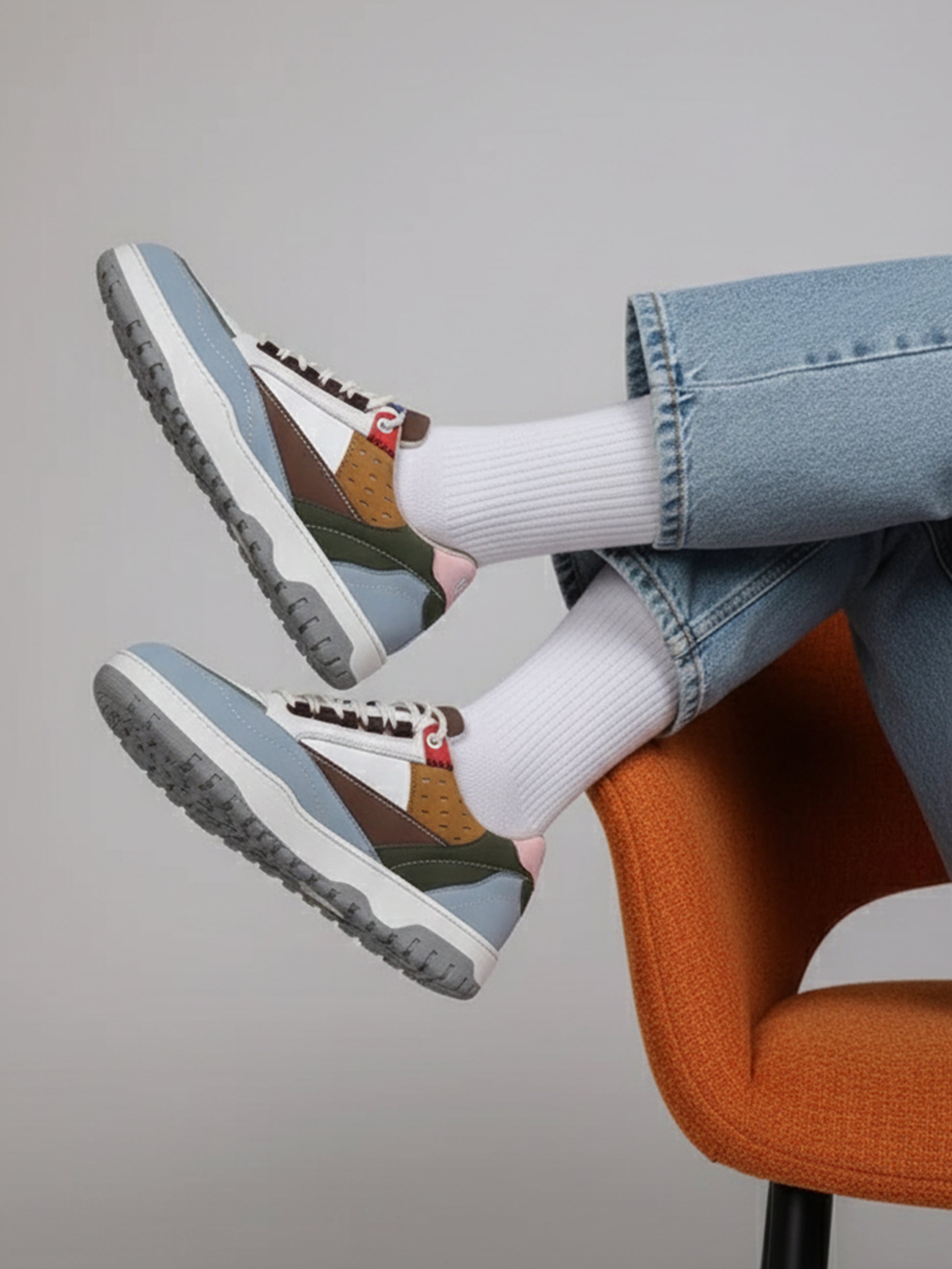 Bold Tones, Rugged Vibes. Earthy greens and browns blend seamlessly with pops of pastel pink and blue, creating a playful yet adventurous palette. The paneled design adds dimension, while a chunky outsole ensures durability and grip. Perforated details keep it breathable and stylish, making this sneaker the perfect companion for those who want a mix of rugged charm and eye-catching flair in every step.